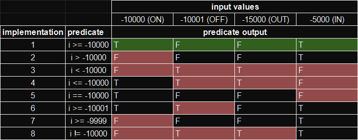 This table shows the output for 8 different predicates based on the input values I've chosen. The first implementation i >= -10000 is correct:
