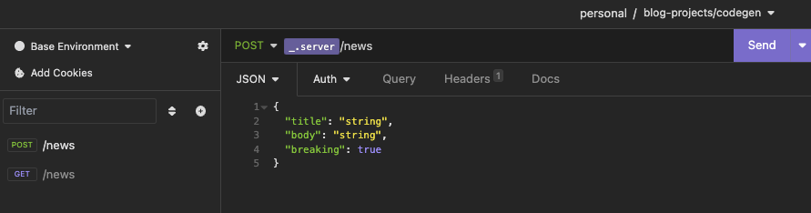 Superb! I also want to check that the request validation works. This JSON body lacks the breaking property: