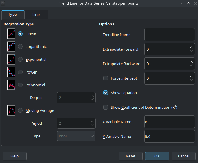We want to see the equation, so select "Show Equation", and then click OK. Repeat that for both Verstappen's and Norris's data points.