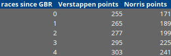 Since we cannot use race names in mathematical equations, for the x-axis I will use the number of races since the British Grand Prix, allowing us to have a clear representation of points growth since the first race in the series.