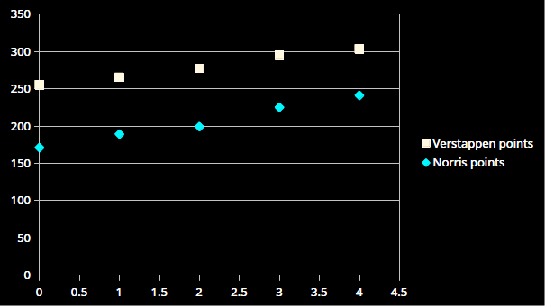 We need some data to build a chart. I am going to use the amount of points that two Formula 1 drivers had after each of the last five races. I want to see if Lando Norris can catch up with the championship leader Max Verstappen by the end of the season.