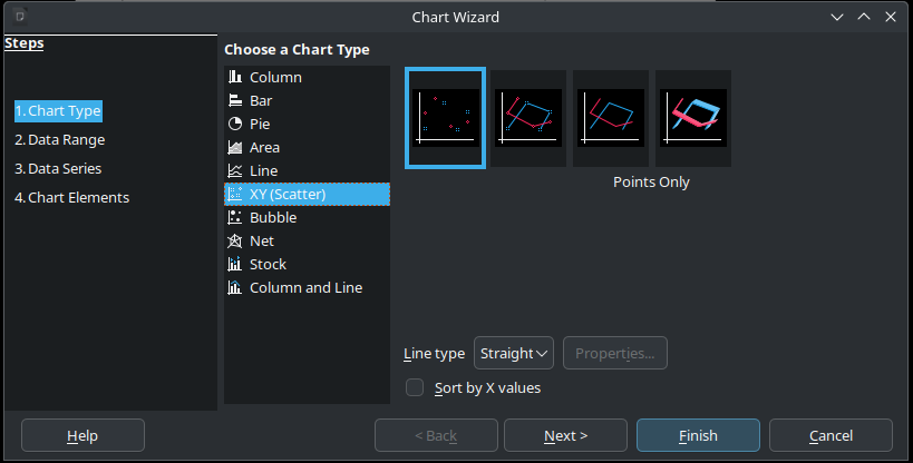 Next, go to Insert -> Chart in the main menu. Pick the XY (Scatter) type and click the Finish button.