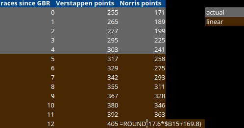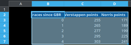 We can use f(x) = 12.6x+253.8 to calculate Max's points after x races, and f(x) = 17.6x+169.8 to calculate Lando's points. By substituting x with a value from the B column (races since the British Grand Prix), LibreOffice can automatically perform the calculations for us. Just enter the formula and drag it down. I round the final result because drivers cannot have 346.789782134 points.