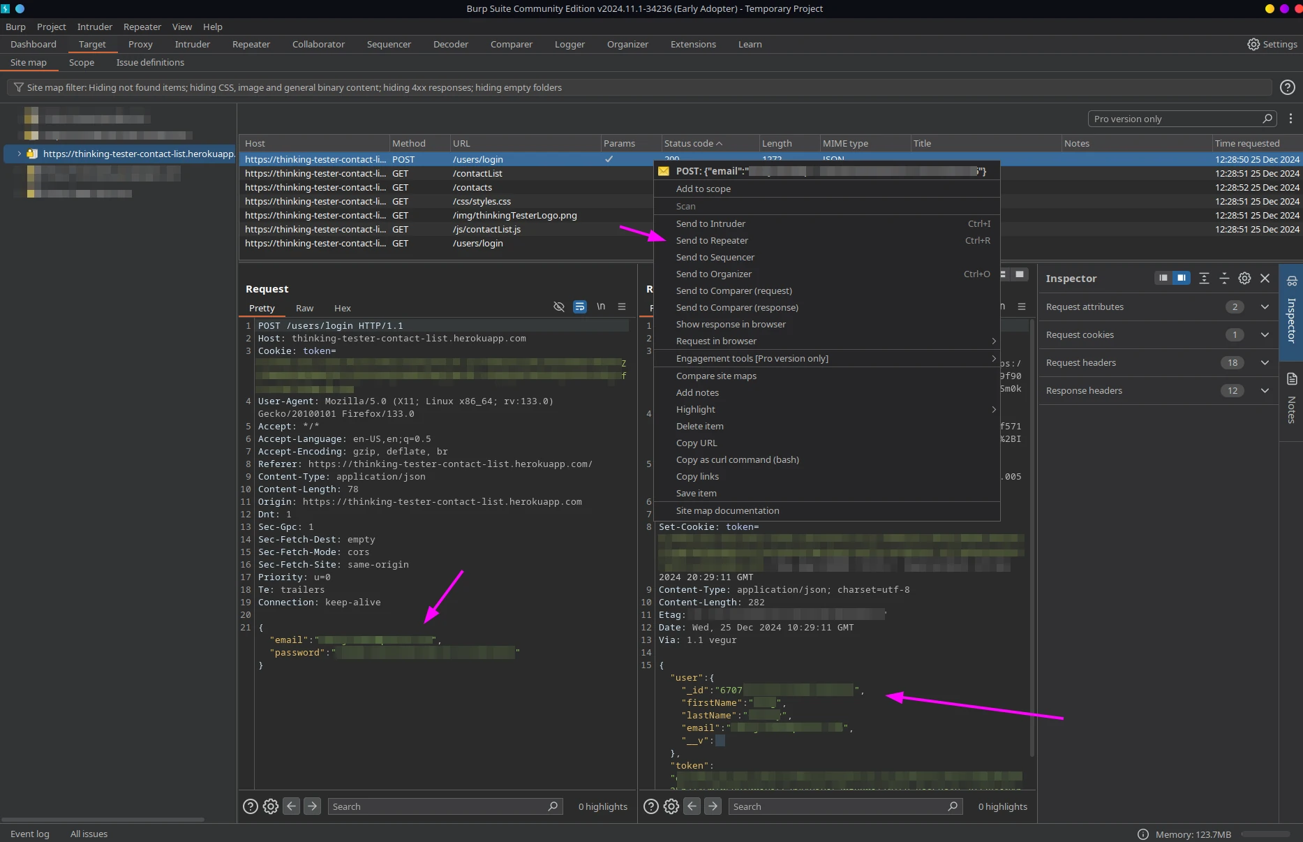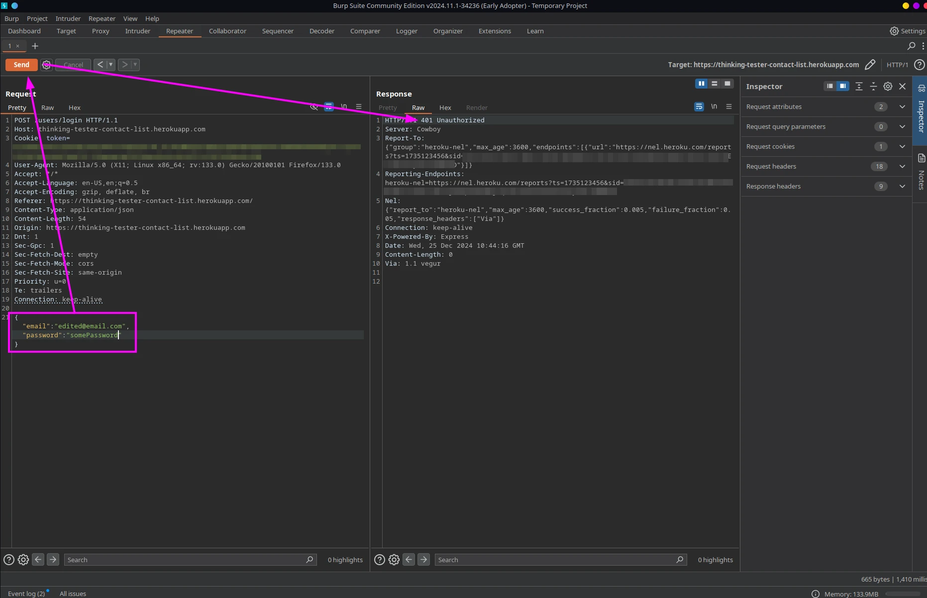 We can also send this request to the Repeater to manipulate and resend it. For instance, we can modify the credentials, send the request, and see what happens. In this case, the server returned a 401 status code - the login attempt wasn't successful.