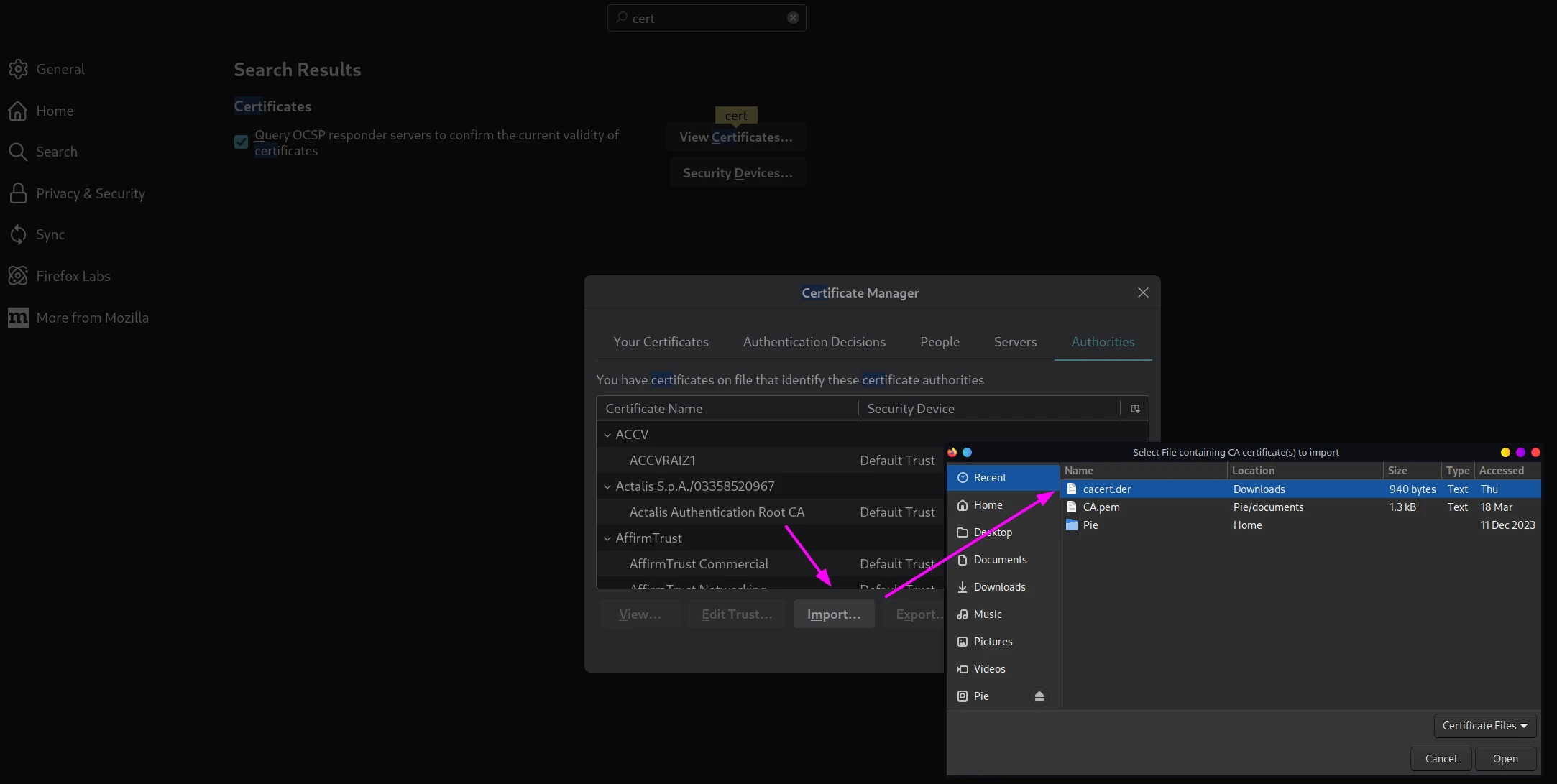 Finally, import the certificate into Firefox. This will make it possible to intercept HTTPS traffic.