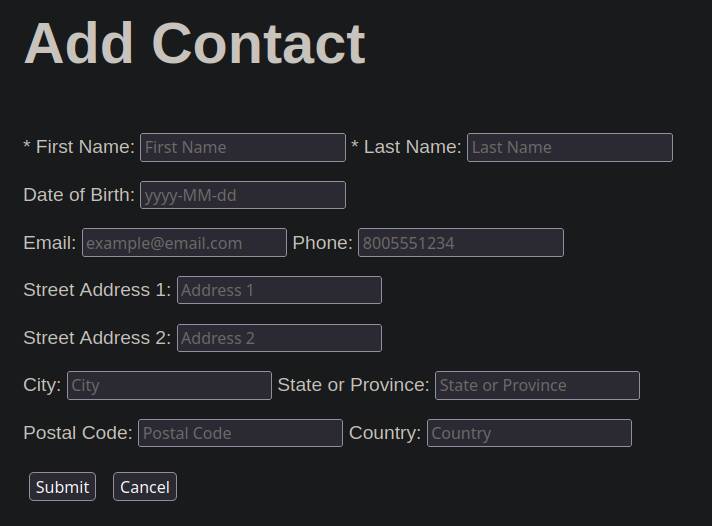 This is where it gets a bit tricky. The website we're using warns us that "the database will be purged as needed to keep costs down". This means that even if we add a contact manually, we can't guarantee that it will always be present in the response to modify. To address this, I implemented the functionality to add a new contact using the UI. I know, this doesn't make much sense to create an object on the UI and then modify it in the API response. But the UI part is only necessary to ensure the stability of the code in this post. It wouldn't exist in a real scenario.