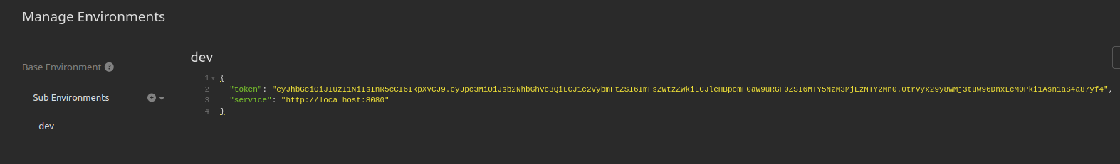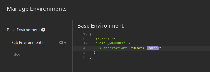 Moreover, you don't need to do this for every environment. I specified global headers for the Base Environment, which is a top-level configuration. Then, I created a sub-environment for my local development environment, where I specified the exact token value. You can override this token for any environment. I think it's really cool.